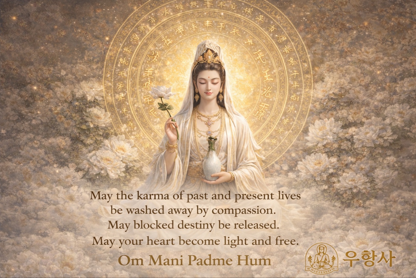 짧은 설명: 마으은 맑게, 삶은 밝게 드고, 멈추고, 깨어나는 자리 한번 호흡, 한 번의 소리로 업은 가볍게, 마음은 자유롭게 소리를 비우고, 지혜로 깨어난다. 관음의 빛, 우황사 숨경 우황사 멈춤이 곧 길이다.